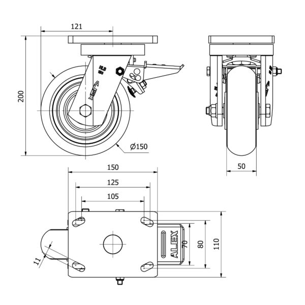 Rueda poliuretano giratoria con freno Alex diametro 150 mm. modelo 2-3538
