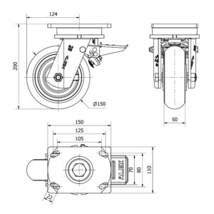 Rueda poliuretano giratoria con freno Alex diametro 150 mm. modelo 2-3728