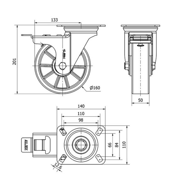 Rueda poliuretano giratoria con freno Alex diametro 160 mm. modelo 2-2536