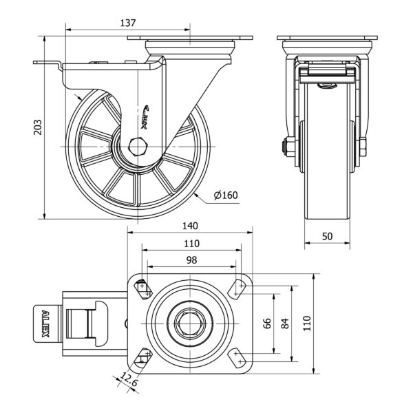 Rueda poliuretano giratoria con freno Alex diametro 160 mm. modelo 2-3851