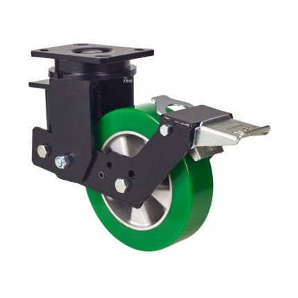 Las ruedas Alex serie HLSB-AUGB son ruedas con el núcleo de aluminio y la banda de poliuretano verde fundido con dureza de 80º shore A, indicadas para soportar altas cargas de hasta 700 Kg. Con soporte de suspensión elástica, mediante la incorporación de un muelle muy resistente para absorber golpes, choques y desniveles. Recorrido de suspensión hasta 25 mm., ideal en suelos irregulares donde su amortiguación actúa. Se utilizan en útiles de transporte logístico, gradas móviles, plataformas elevadoras, carros de transporte, maquinaria pesada del sector de la construcción y grúas móviles. AUGB: Poliuretano verde de gran capacidad de carga y absorción de golpes.