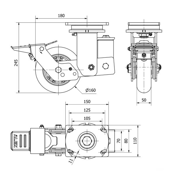 Rueda poliuretano giratoria con freno Alex diametro 160 mm. modelo 2-4055