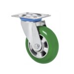 La serie de ruedas Alex ZVR-AUAGB son ruedas con el núcleo de aluminio y la banda de poliuretano verde de dureza 80º shore A, indicadas para soportar cargas hasta 650 Kg. Se utilizan en útiles de transporte logístico, carros de herramientas, empresas de alimentación, barredoras, pulidoras, maquinaria pesada, grúas móviles, mesas elevadoras, caldererías y contenedores. AUAGB: Poliuretano verde de gran capacidad de carga, con buena absorción de golpes, y con menor esfuerzo al giro y desplazamiento.