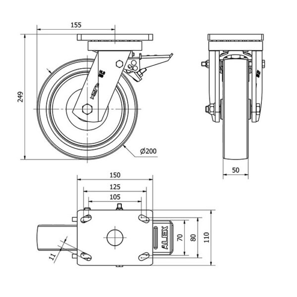 Rueda poliuretano giratoria con freno Alex diametro 200 mm. modelo 2-1530