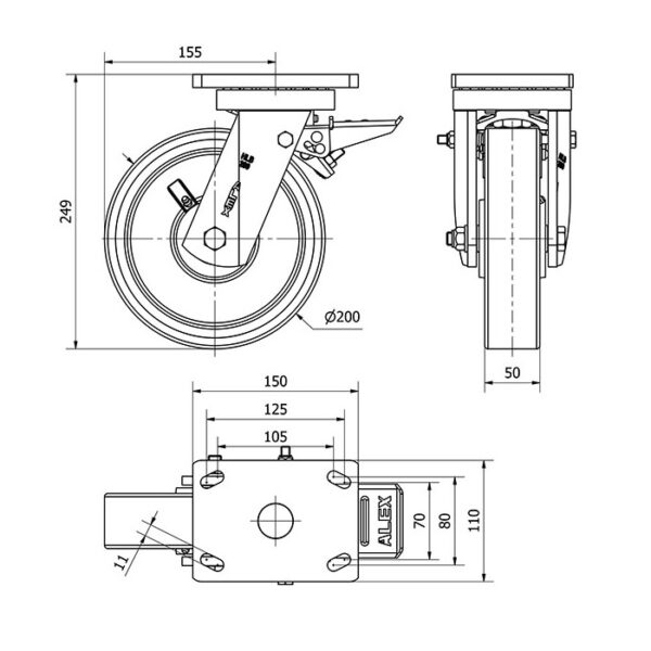 Rueda poliuretano giratoria con freno Alex diametro 200 mm. modelo 2-1762