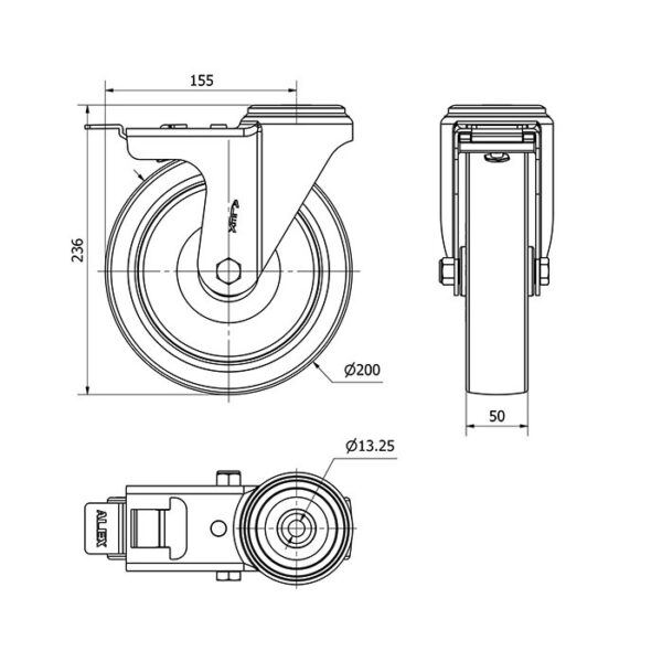 Rueda poliuretano giratoria con freno Alex diametro 200 mm. modelo 2-2383
