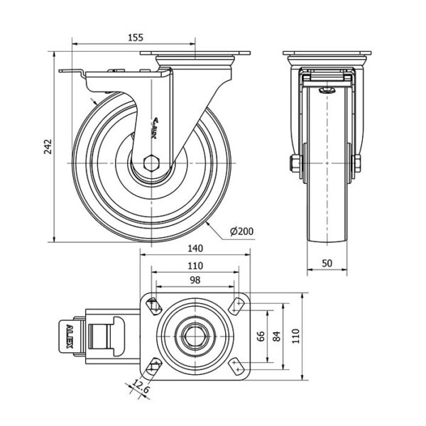 Rueda poliuretano giratoria con freno Alex diametro 200 mm. modelo 2-3464