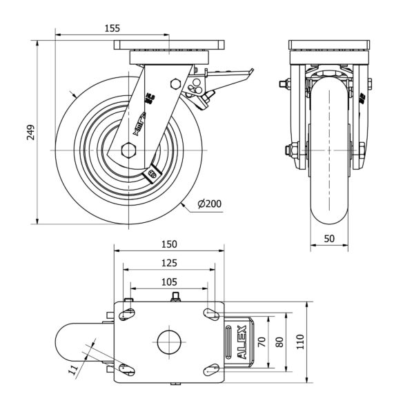 Rueda poliuretano giratoria con freno Alex diametro 200 mm. modelo 2-3539