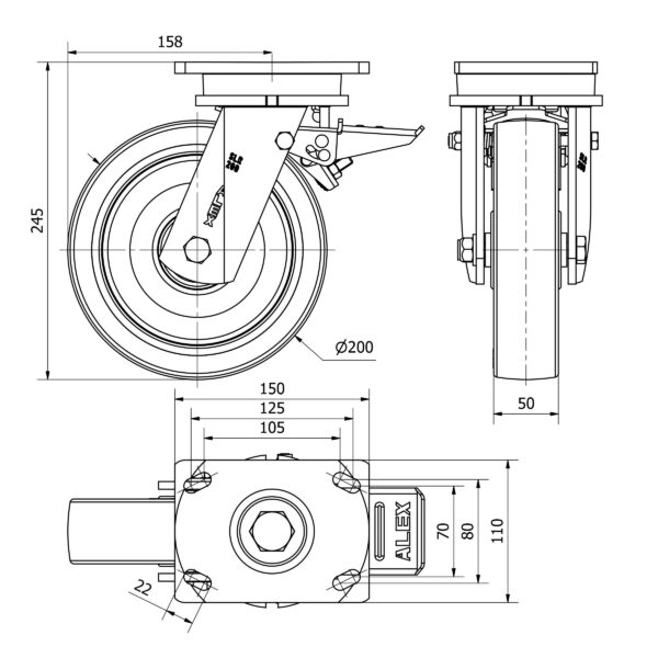 Rueda poliuretano giratoria con freno Alex diametro 200 mm. modelo 2-3662 EAN 8422202236629