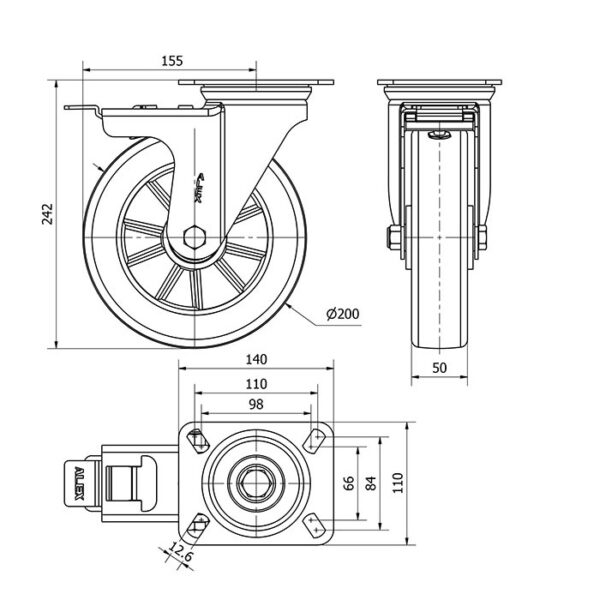 Rueda poliuretano giratoria con freno Alex diametro 200 mm. modelo 2-3694