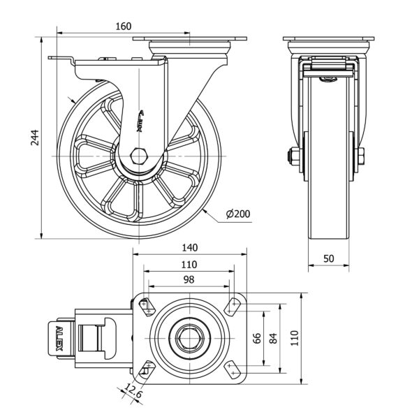 Rueda poliuretano giratoria con freno Alex diametro 200 mm. modelo 2-3855
