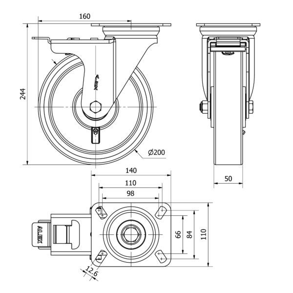 Rueda poliuretano giratoria con freno Alex diametro 200 mm. modelo 2-3871