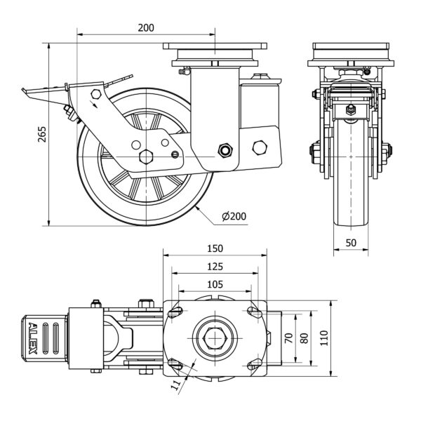 Rueda poliuretano giratoria con freno Alex diametro 200 mm. modelo 2-3953