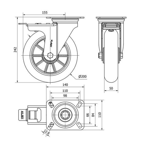 Rueda poliuretano giratoria con freno Alex diametro 200 mm. modelo 2-3985