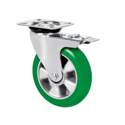 La serie de ruedas Alex ZVR-AUAGB son ruedas con el núcleo de aluminio y la banda de poliuretano verde de dureza 80º shore A, indicadas para soportar cargas hasta 650 Kg. Se utilizan en útiles de transporte logístico, carros de herramientas, empresas de alimentación, barredoras, pulidoras, maquinaria pesada, grúas móviles, mesas elevadoras, caldererías y contenedores. AUAGB: Poliuretano verde de gran capacidad de carga, con buena absorción de golpes, y con menor esfuerzo al giro y desplazamiento.
