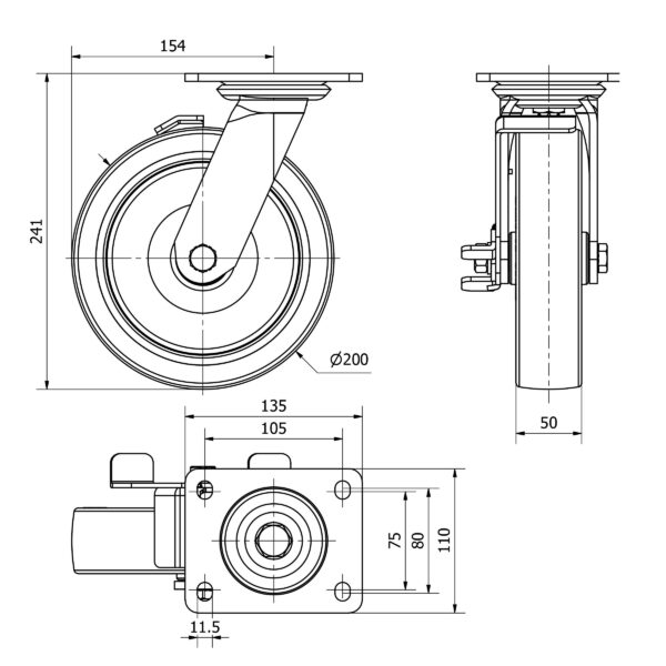 Rueda poliuretano giratoria con freno Alex diametro 200 mm. modelo 4-1613