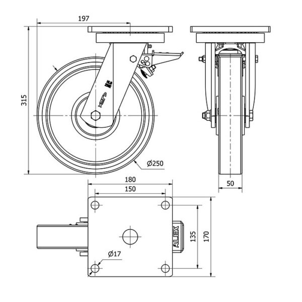 Rueda poliuretano giratoria con freno Alex diametro 250 mm. modelo 2-1763
