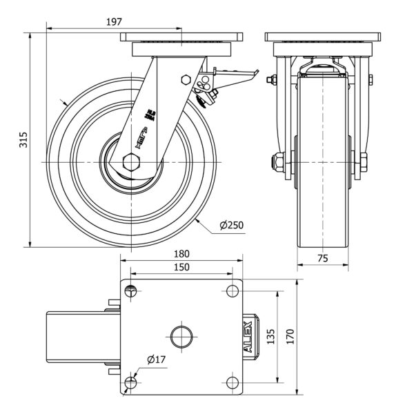 Rueda poliuretano giratoria con freno Alex diametro 250 mm. modelo 2-3742