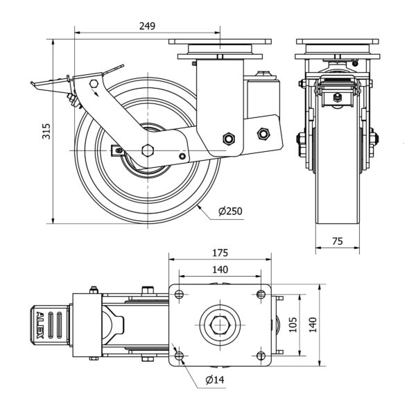 Rueda poliuretano giratoria con freno Alex diametro 250 mm. modelo 2-3947