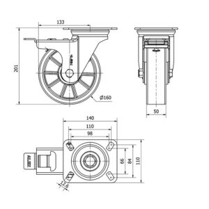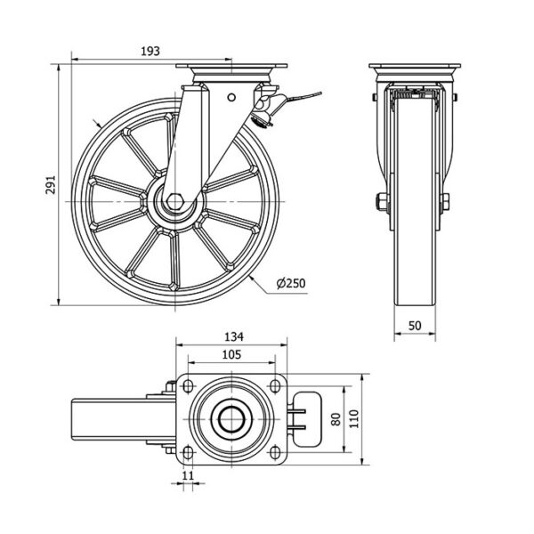 Rueda poliuretano giratoria con freno Alex diametro 250 mm. modelo 2-4685