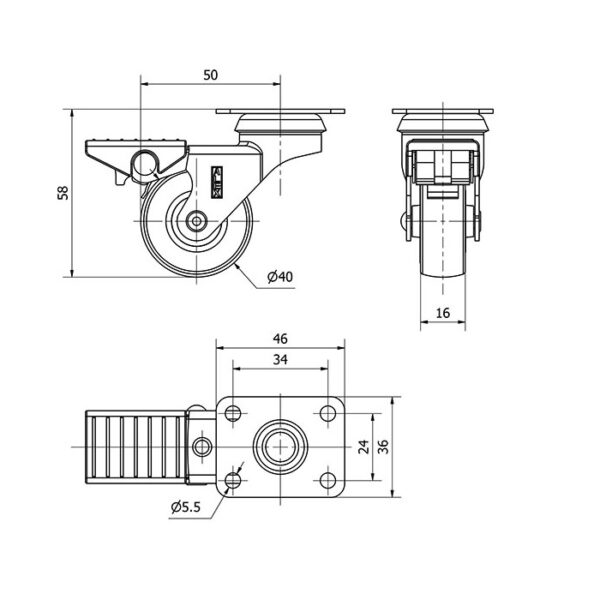 Rueda poliuretano giratoria con freno Alex diametro 40 mm. modelo 1-0750