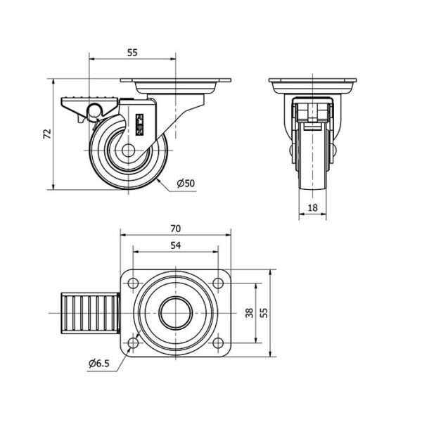 Rueda poliuretano giratoria con freno Alex diametro 50 mm. modelo 1-0751