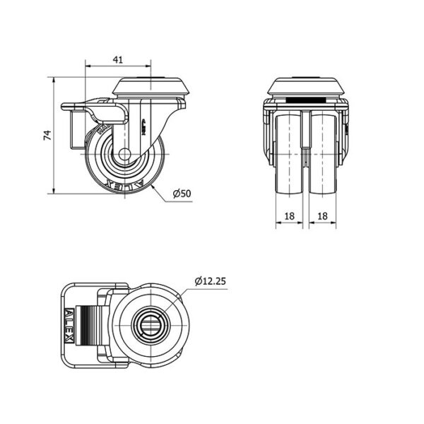 Rueda poliuretano giratoria con freno Alex diametro 50 mm. modelo 1-0795