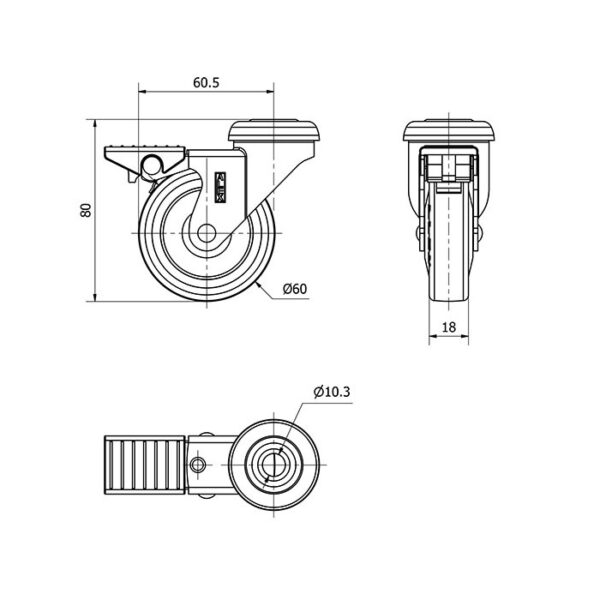 Rueda poliuretano giratoria con freno Alex diametro 60 mm. modelo 1-0755