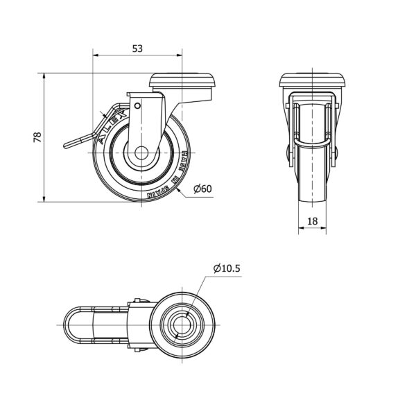 Rueda poliuretano giratoria con freno Alex diametro 60 mm. modelo 2-2576