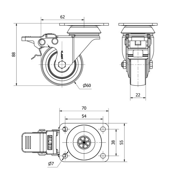 Rueda poliuretano giratoria con freno Alex diametro 60 mm. modelo 2-4476