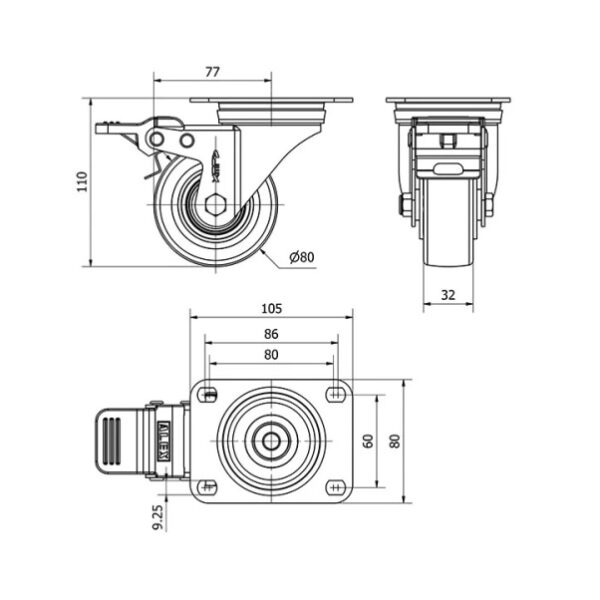 Rueda poliuretano giratoria con freno Alex diametro 80 mm. 2-0337