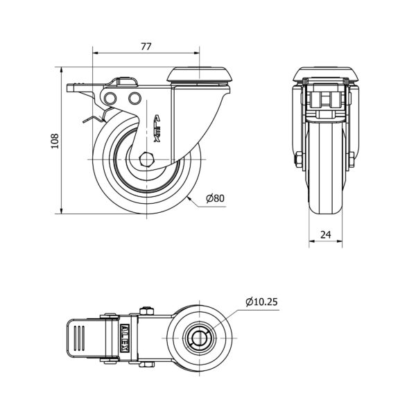 Rueda poliuretano giratoria con freno Alex diametro 80 mm. modelo 2-2470