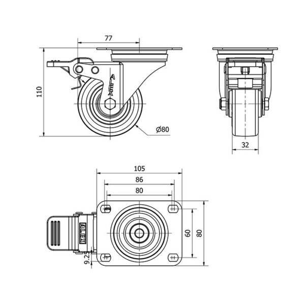 Rueda poliuretano giratoria con freno Alex diametro 80 mm. modelo 2-2935