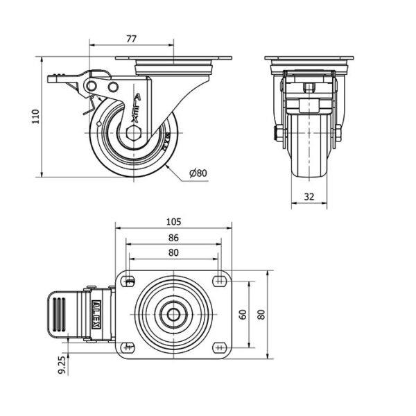 Rueda poliuretano giratoria con freno Alex diametro 80 mm. modelo 2-4700