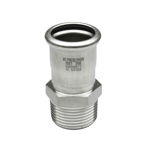 Enlace de unión con conexión prensar macho para tubería de acero inoxidable, fabricada en acero inoxidable A-316L según la normativa EN-14404, con juntas tóricas en EPDM/FKM y con rosca de acuerdo a DIN-2999. La curva soporta una presión máxima de 16 bar a 90°C. y de 6 bar a 180°C. Soporta un rango de temperatura de -20 a 110°C. con junta en EPDM y de -20 a 180°C con junta KFM. Cumple con los requisitos según UNE-EN-10088, así como DVGW GW534-2004 y DVGW GW541:2004-10. Está indicada para su uso en agua sanitaria, calefacción, contra incendios y aire comprimido (libre de aceite) si dispone de junta tórica en EPDM y para aceites, hidrocarburos (excepto gasoil), instalaciones solares y aire comprimido, si dispone de junta en FKM. Los accesorios inoxidables para prensar son aptos para tubos que cumplen con las especificaciones DVGW GW 541 y UNE-EN-10088. Los productos Corix son piezas de acero inoxidable de gran calidad, específicamente pensados para el ámbito industrial. Toda la gama está fabricada bajo estrictos parámetros de calidad cumpliendo con las más altas certificaciones en conducción de fluidos.