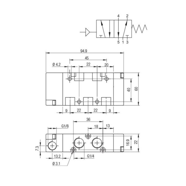 Valvula monoestable Aignep 5/2 1/4″ retorno muelle 01VP050003