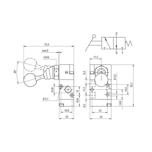 Valvula palanca monoestable Aignep 3/2 N.C. 1/8″ retorno muelle 01VL03NC02